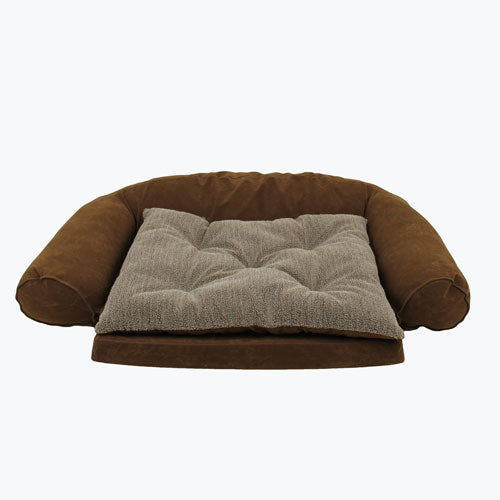 Our updated design with tufted reversible cushion for two beds in one. Velvet microfiber fabric. Orthopedic foam base for comfort and relief on joints. Zippered cover is removable for easy machine washing. Bolsters and cushion have our 100% polyester high loft fill for added comfort.